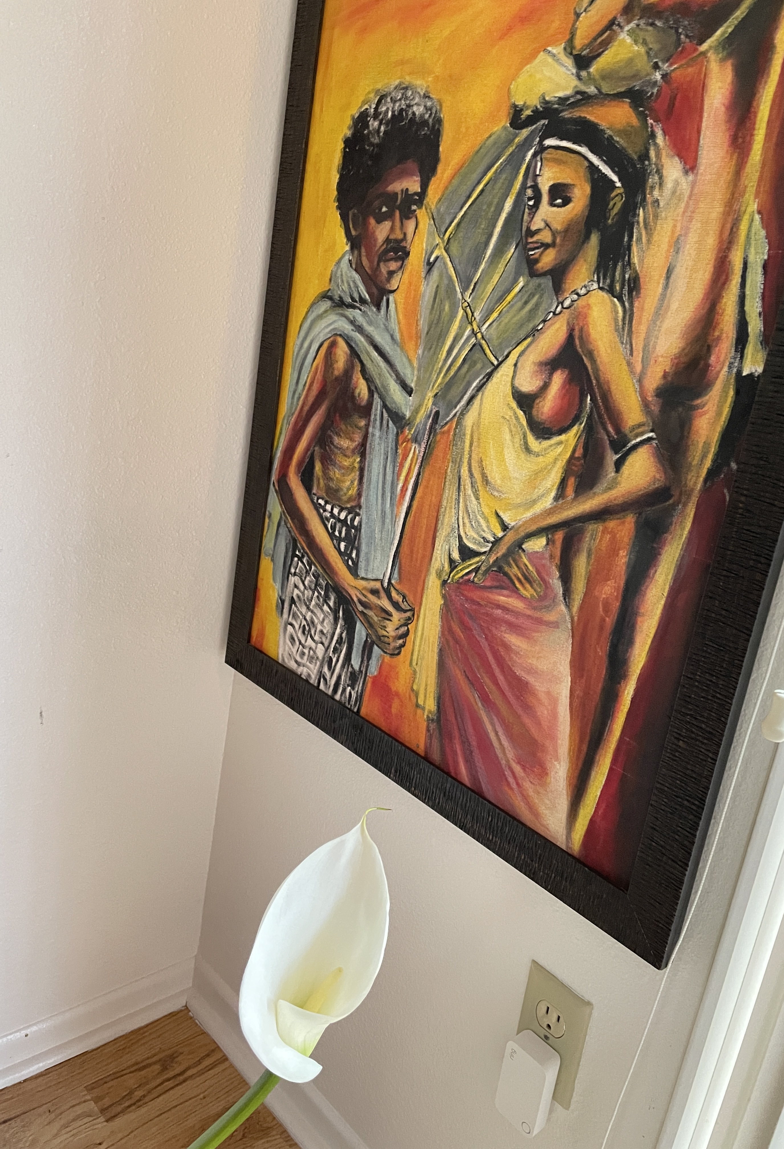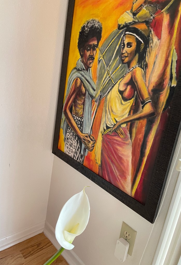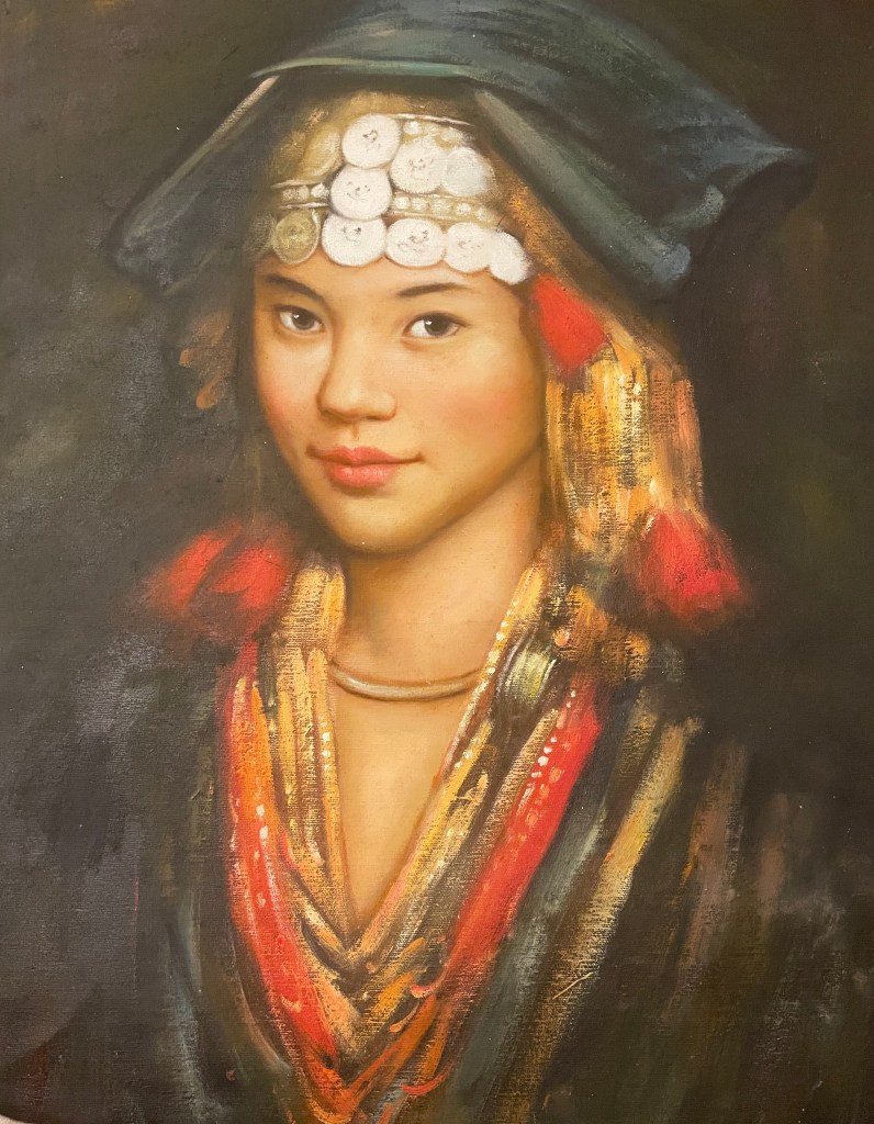 I recently returned from Laos with these beauties. I am just amazed at the skill and depth of the painter. They were painted in 1987 and I truly believe he captured the essence of life at that time as well as years gone by. He also painted the one below. They cost me less than $100 and I am still in awe. Below the young lady is a painting I saw in a shop in Ethiopia. It really was not for sale I found out but when asked the merchant sold it to me for $10. I love how sassy that woman who is holding up the world looks.